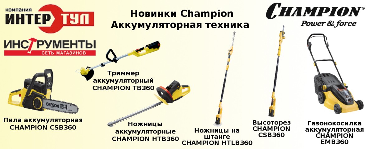 В середине 2014 года компания CHAMPION не прекращает радовать своих покупателей очередными новинками - ранее мы Вас знакомили обновлением бензотехники, а сейчас представляем новый сегмент продукции CHAMPION - аккумуляторная техника!