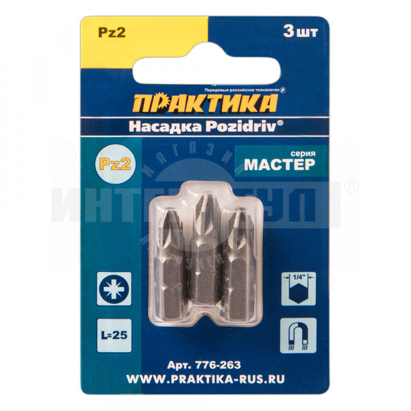 Биты ПРАКТИКА "Мастер" PZ2 25мм (3шт в упаковке) предназначены для профессионального использования. Изготовлены из легированной хромванадиевой стали (CrV-S2) с поверхностным упрочнением до твердости 58-59 HRC токами высокой частоты (ТВЧ). Имеют проточенную головную часть для работы в узких местах. Точная форма рабочей части обеспечивает идеальную фиксацию в шлицах самореза. Боковая поверхность отполирована. Магнитные свойства позволяют удерживать саморез в любом удобном положении.