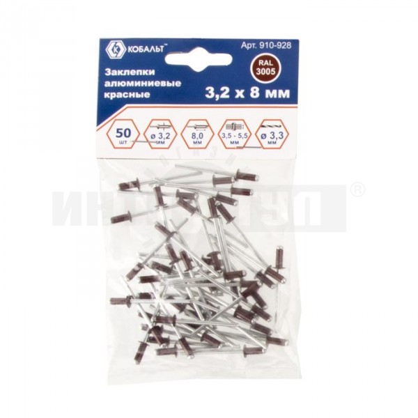 Заклепки КОБАЛЬТ алюминиевые, 3,2 х 8 мм, красные RAL 3005 (50 шт.) пакет