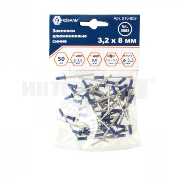 Заклепки КОБАЛЬТ алюминиевые, 3,2 х 8 мм, синие RAL 5005 (50 шт.) пакет
