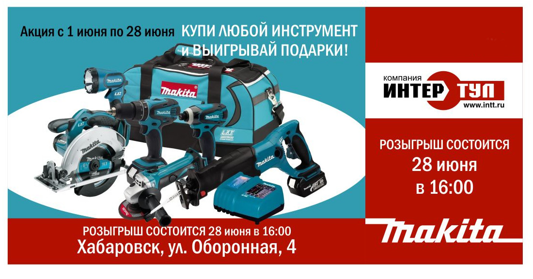 А так же в 16:00 состоится розыгрыш подарков по купонам, которые можно получить, совершив покупку любого электроинструмента Makita в сети магазинах "Инструменты" г. Хабаровска.