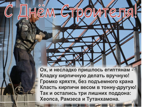 Но главная доля мастерства досталась вам – строителям, без которых как-то и не представить современный мир. Примите поздравления с профессиональным праздником, труженики! Держите инструмент в руках покрепче, а счастье и веру в лучшее – поближе к сердцу!
