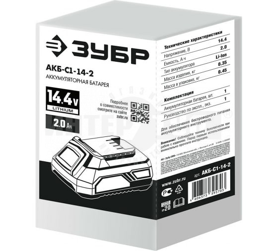 ЗУБР 14.4В, Li-Ion, 2Ач, тип С1, аккумуляторная батарея. АКБ-С1-14-2