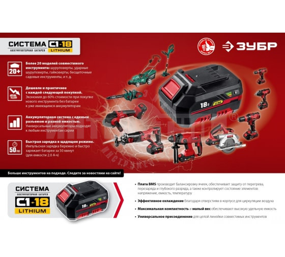 Аккумуляторная батарея ЗУБР совместима с шуруповертом, ударным шуруповертом, гайковертом, садовым бесщеточным инструментом.