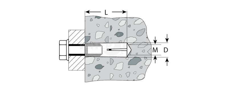 Фиксация анкера в основании достигается путем вкручивания болта. При этом происходит расклинивание, и анкер удерживается в основании за счет сил трения,