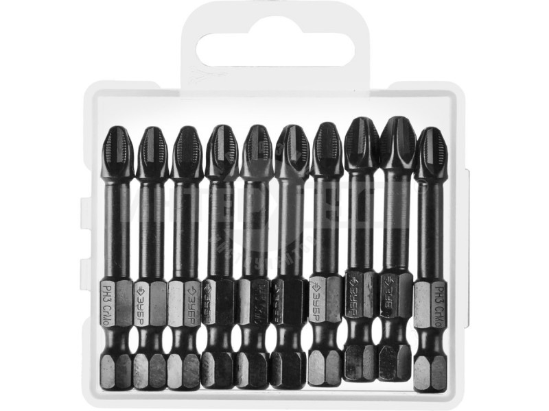 Биты ЗУБР "ПРОФИ" Phillips, тип хвостовика E 1/4", PH3, 50мм, 10шт, в пластиковом боксе, на карточке