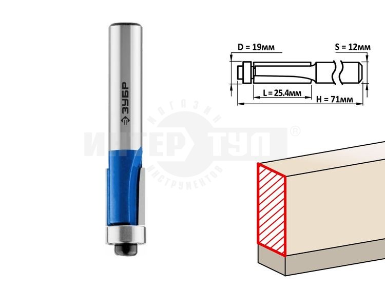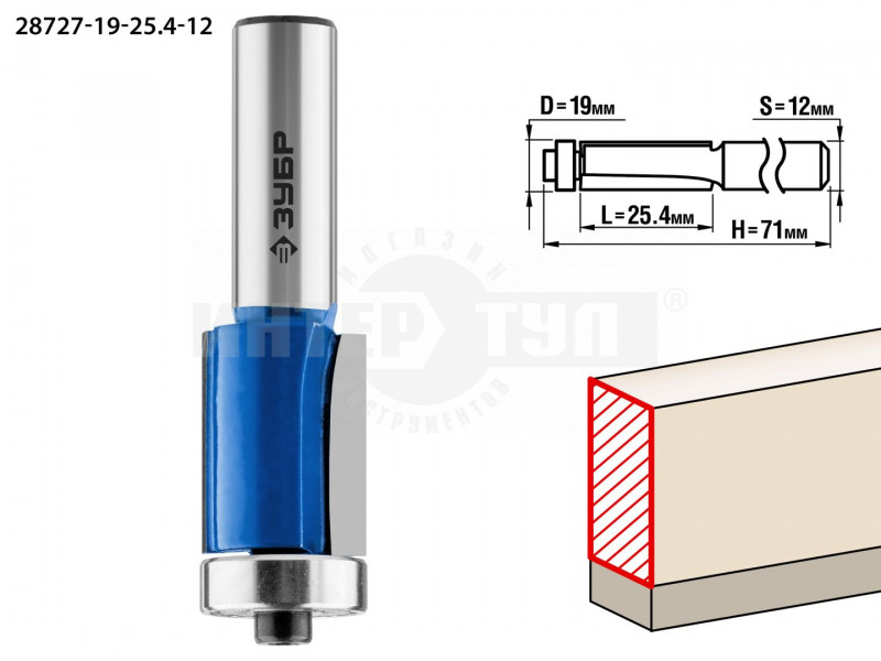 Фреза кромочная с нижним подшипником, D= 19мм, рабочая длина-25,4мм, хв.-12мм, d-19мм, ЗУБР Професси
