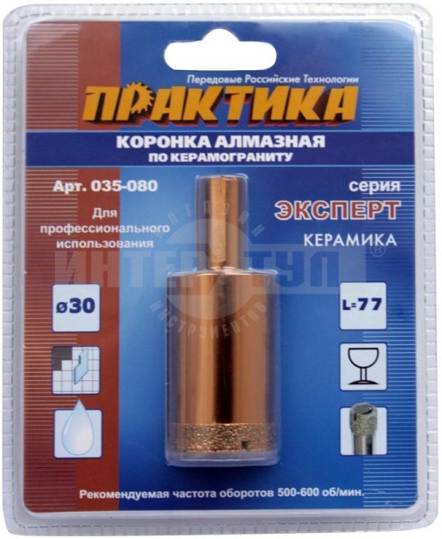 Обороты максимальные, об/мин: 600Тип коронки Алмазная по керамограниту Хвостовик SDS-plus Длина коронки 77.00 мм Назначение керамика Набор нет Диаметр (мм) 30.00 мм -