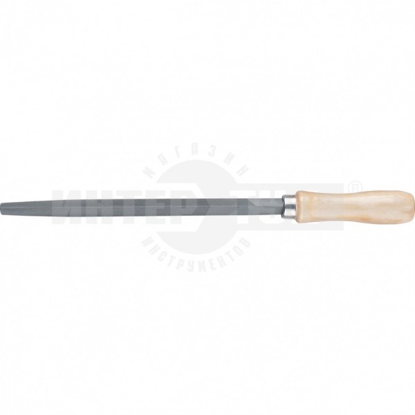Напильник предназначен для качественной обработки плоских поверхностей и трехгранных отверстий в твердых материалах. Инструмент имеет двойную перекрестную насечку №2. Площадь сечения напильника уменьшается от середины к носу. Напильник изготовлен из углеродистой стали. Поставляется в комплекте с деревянной рукояткой, которая покрыта бесцветным лаком, защищающим древесину от рассыхания и набухания.
