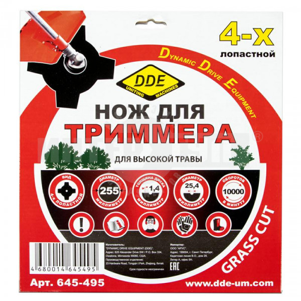 Четырех-лопастной диск DDE Grass Cut. Диск идеально подходит для густой и сочной травы. За счет дополнительной острой грани по густой траве производительность выше чем у трехлопастного на 24%. Важно! Необходимо тщательно следить за состоянием заточки режущих граней, и вовремя их подтачивать. Диск можно эксплуатировать со всеми типами и мощностями триммеров с прямой штангой, но лучшие показатели достигаются на триммерах мощностью от 1,3 лошадиных силы (объем двигателя 32см3).