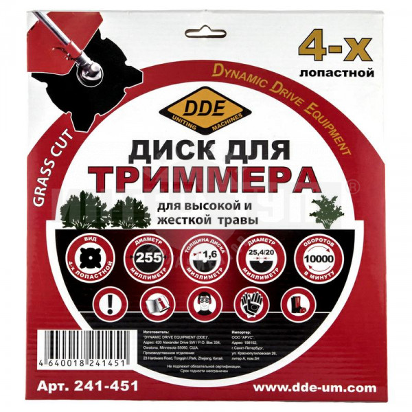 Четырех-лопастной диск DDE Grass Cut. Диск для больших площадей кошения с последующей уборкой скошенной травы граблями. Форма диска позволяет собирать скошенную траву в валок с каждого замаха триммера. Работа этого диска очень похожа на работу классической ручной косой. Диск можно использовать при заготовке сена. Не рекомендуется использовать данный диск на сильно заросших участках с большим количеством жестких сорняков.
