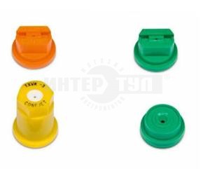 Комплект из четырех форсунок для ручного распылителя с разными радиусами и секторами полива: две плоскоструйные, предназначенные для равномерного опрыскивания больших площадей, и две полые конусные, которыми опрыскивают отдельные растения. Это помогает дозированно расходовать растворы.