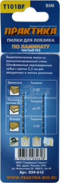 Назначение пилки по ламинату Шаг зубьев 2,5 Рабочая длина 75 Количество в комплекте 2 Тип пилки T101BF Биметаллические пилки из высококачественной легированной стали. Шлифованные неразведённые зубья, шаг 2,5 мм, для аккуратных и чистых распилов.