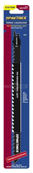 Пилка для лезвийной (сабельной) пилы Практика 244-353 тип S1617HM предназначена для пиления минеральных материалов: газо-пенобетона до 250мм, силикатного кирпича, ЦСП, шифера; дерева, толстого ДСП, пакетов материалов, замороженных продуктов; имеет узкое удлиненное полотно с напайками из карбида вольфрама ВК8. Обеспечивает высокую скорость пиления, как поперек, так и вдоль волокон. Длина общая/рабочая 305/285мм, шаг зубов 8,5мм, ширина пропила >2,2 мм. 1шт. Серия "Эксперт".