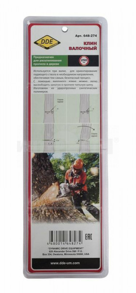 Клин для валки деревьев DDE (валочный клин) – это инструмент лесоруба для направленной валки деревьев, если дерево немного наклонено в противоположную сторону, или чтобы исключить зажим шины бензопилы в пропиле дерева. Материал из которого изготовлен клин для валки деревьев DDE – ударопрочный полиамид (прочный пластик). Щёчки клиньев имеют зацепы, чтобы клин не выскальзывал из пропила.
