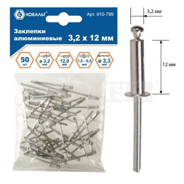 Заклепки 3.2х12мм 50шт алюм Кобальт