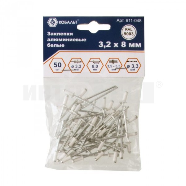 Заклепки КОБАЛЬТ алюминиевые, 3,2 х 8 мм, белые RAL 9003 (50 шт.) пакет