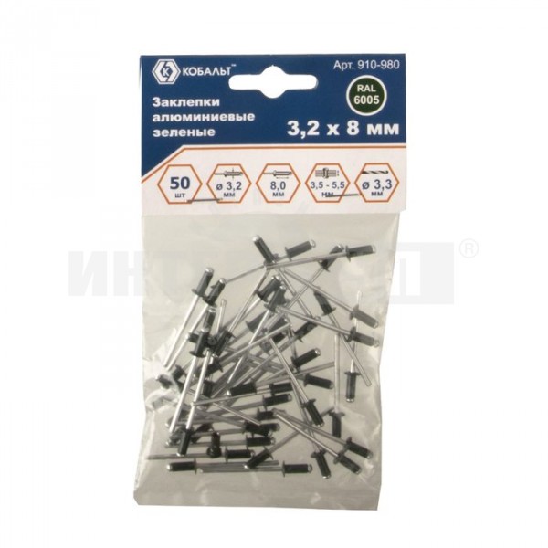 Заклепки КОБАЛЬТ алюминиевые, 3,2 х 8 мм, зеленые RAL 6005 (50 шт.) пакет