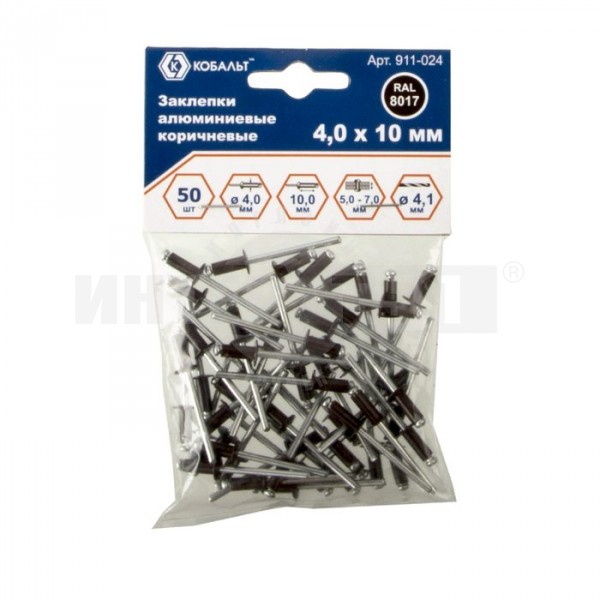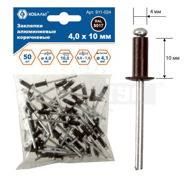 Заклепки КОБАЛЬТ алюминиевые, 4,0 х 10 мм, коричневые RAL 8017 (50 шт.) пакет