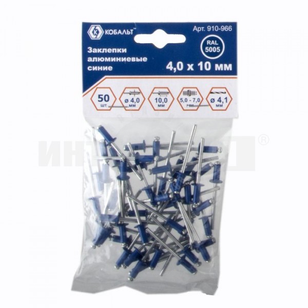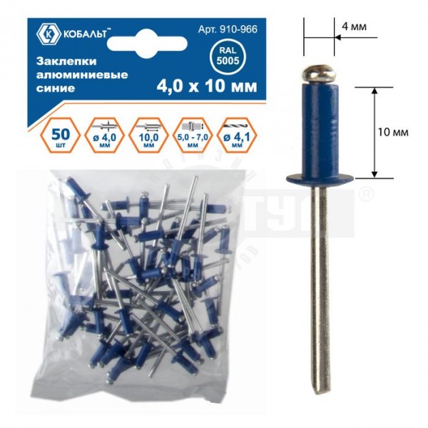 Заклепки КОБАЛЬТ алюминиевые, 4,0 х 10 мм, синие RAL 5005 (50 шт.) пакет