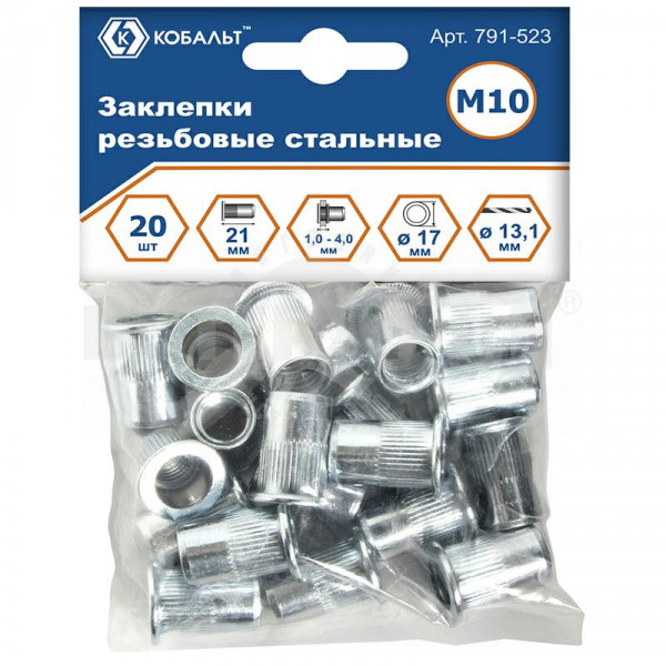 Заклепки резьбовые M10x21.5мм сталь 20шт Кобальт