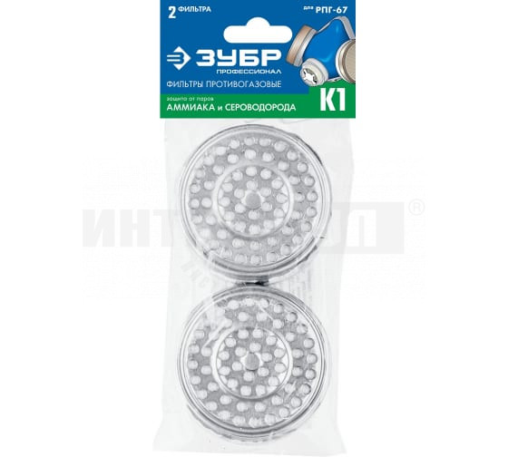 Фильтры ЗУБР К1, для РПГ-67, два фильтра в упаковке – противогазовые фильтры марки К1, которые используются совместно с респиратором. Служат для защиты от воздействия паров аммиака и его органических производных, сероводорода.